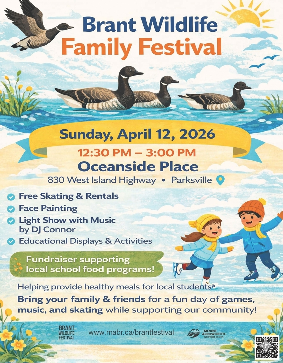 Arrowview Elementary School will host the 3rd annual Brant Wildlife Children's Festival in their gymnasium. Please join us for this public celebration of learning orchestrated by Arrowview Elementary students and teachers together with the Mount Arrowsmith Biosphere Region. The Brant Wildlife Children's Festival underscores our community's passion for collaboration and the environment featuring educational displays from over 25 different Vancouver Island groups together with students from preschool through high school. This event provides insight into our youth's devotion for preserving nature while paralleling the community groups' endeavours. Bridging the gap between classrooms and the community, fostering a collective sense of responsibility for the environment together.