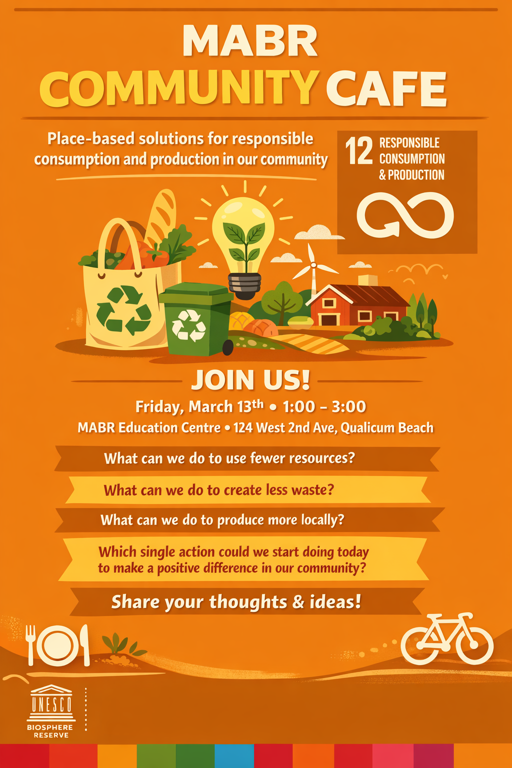 This conversation is part of our MABR Community Café series, hosted in the UNESCO Mount Arrowsmith Biosphere Region, exploring local solutions to global challenges. Together, we’ll connect with SDG12 – Responsible Consumption and Production and see how our community can make a real impact.