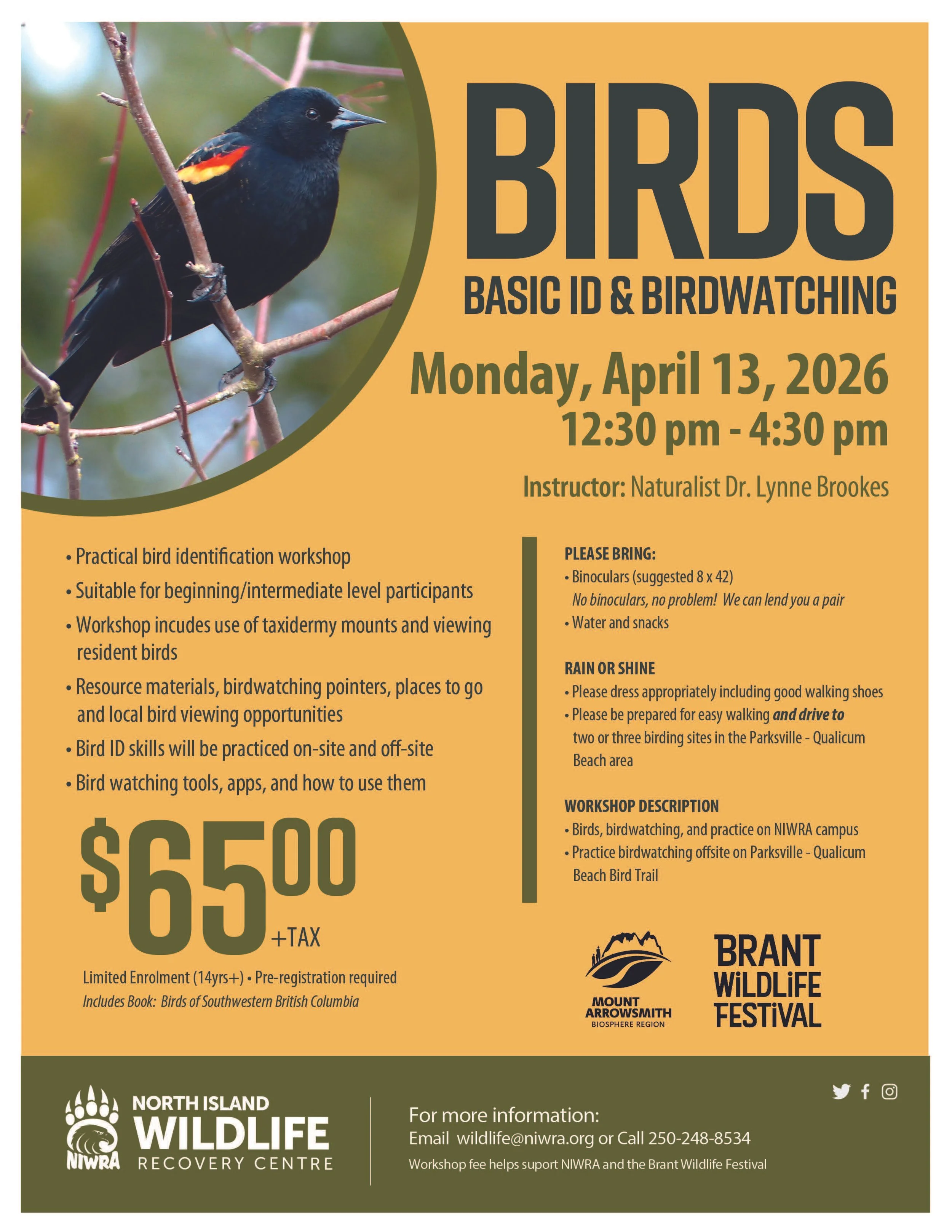 A practical bird identification workshop, led by naturalist Dr. Lynne Brookes. This workshop is suitable for beginning/intermediate level participants and includes use of taxidermy mounts and viewing resident birds. Resource materials, birdwatching pointers, places to go and local bird viewing opportunities are all included. Bird ID skills will be practiced on-site at the North Island Wildlife Recovery Centre, and off-site in the Parksville-Qualicum Beach area.