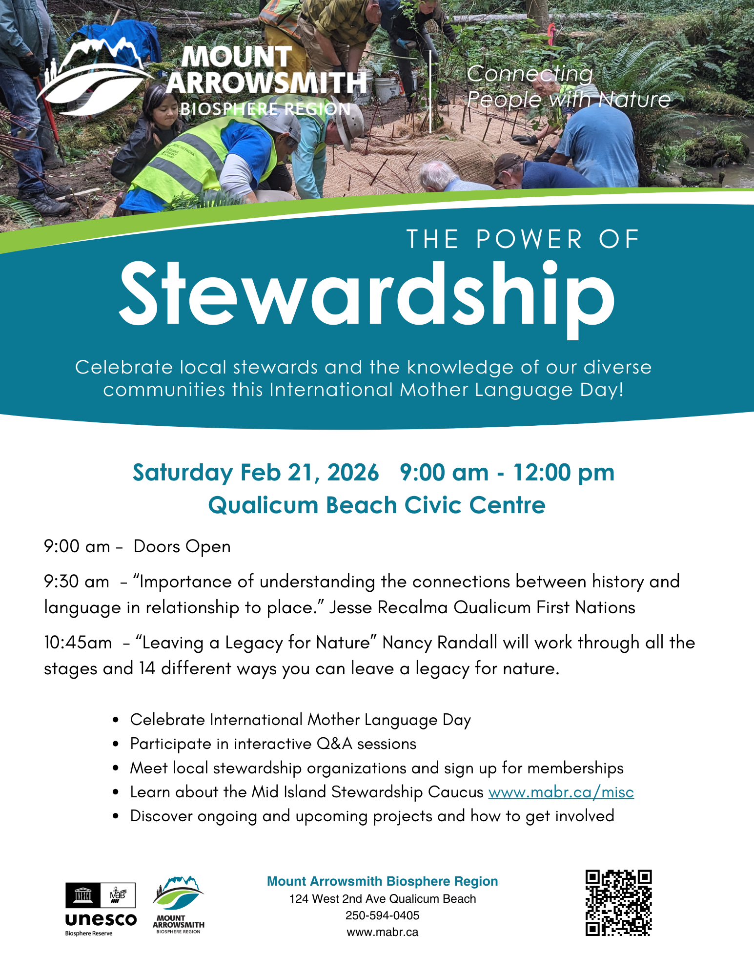 Join the Mount Arrowsmith Biosphere Region for the 2nd annual Power of Stewardship, a free community event that brings people together to celebrate environmental care, cultural connections, and International Mother Language Day.